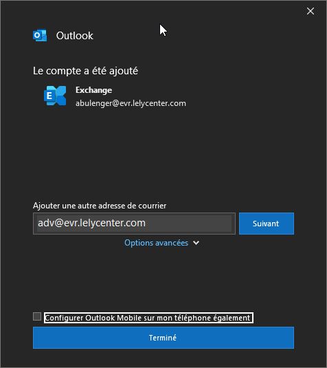- Une fois validé ce devrais être bon! Vous pouvez ensuite cliquer sur "Terminer" et utiliser votre boite mail ou ajouter une autre adresse si besoin et recommencer le procéssus.